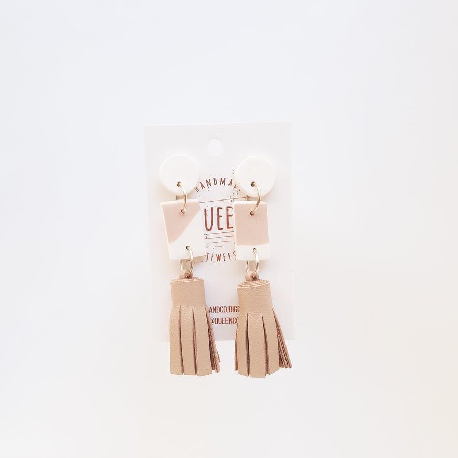 Materials: Polymer Clay; Handmade Leather Tassels; surgical steel posts and backs